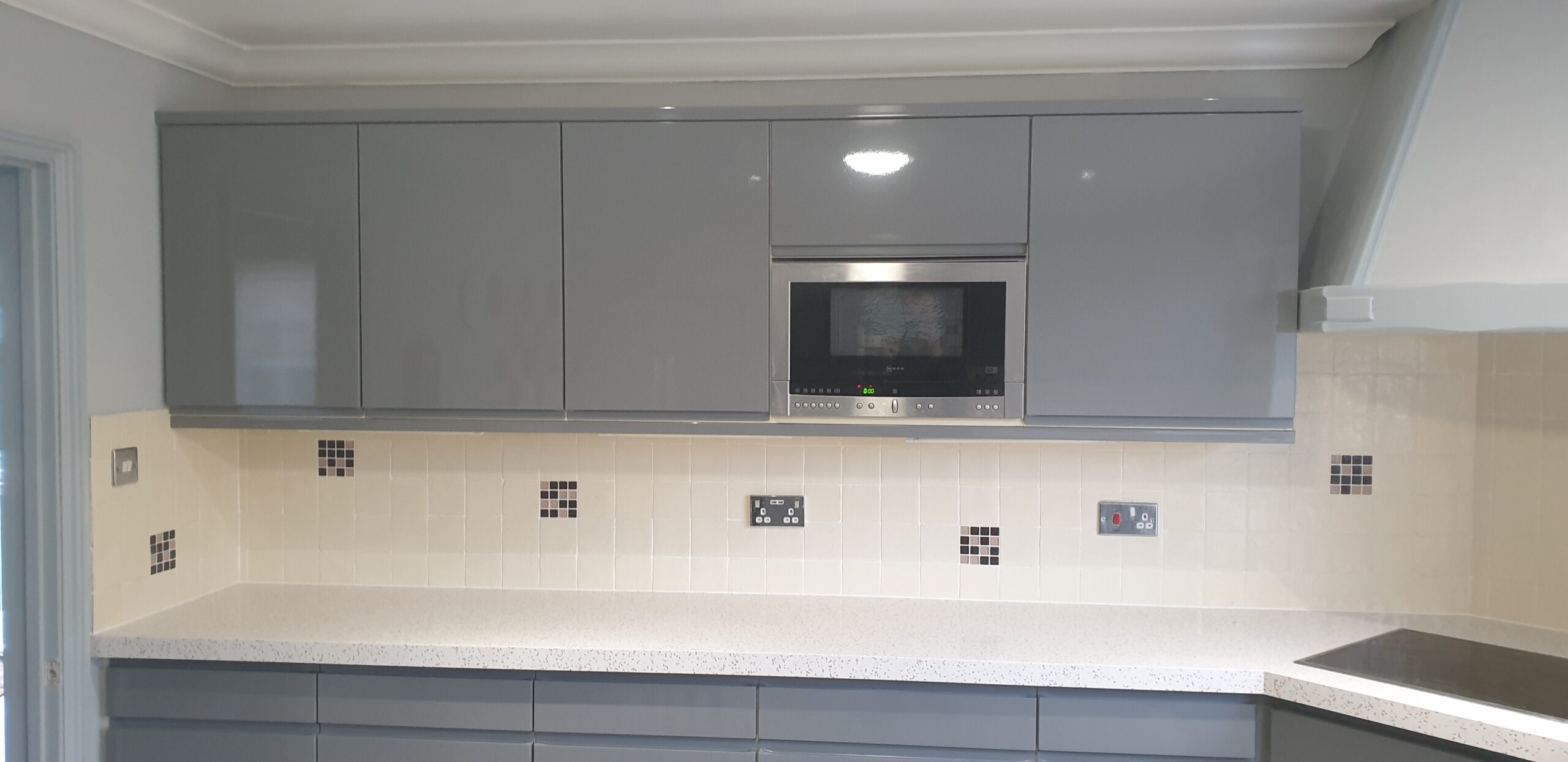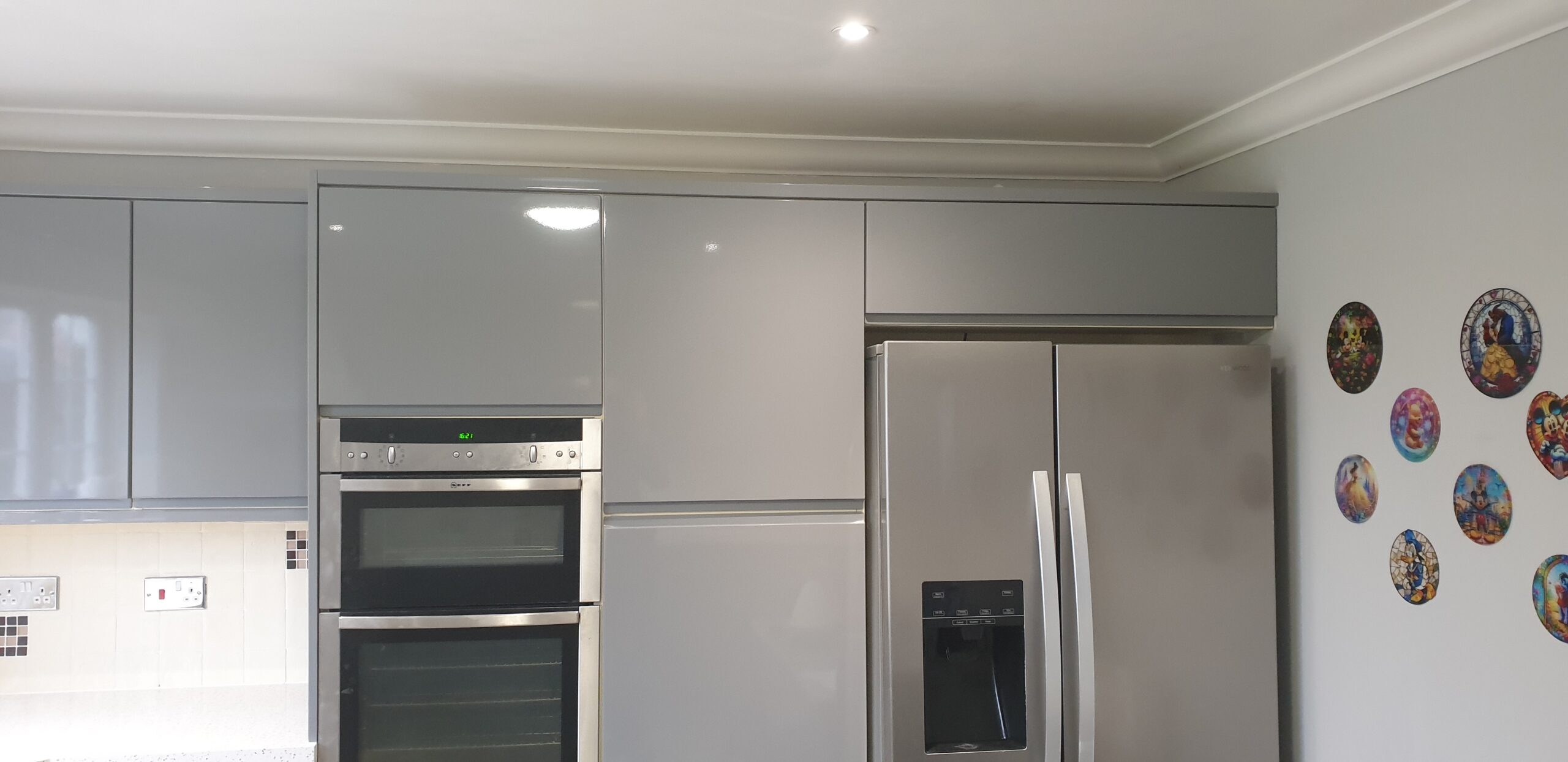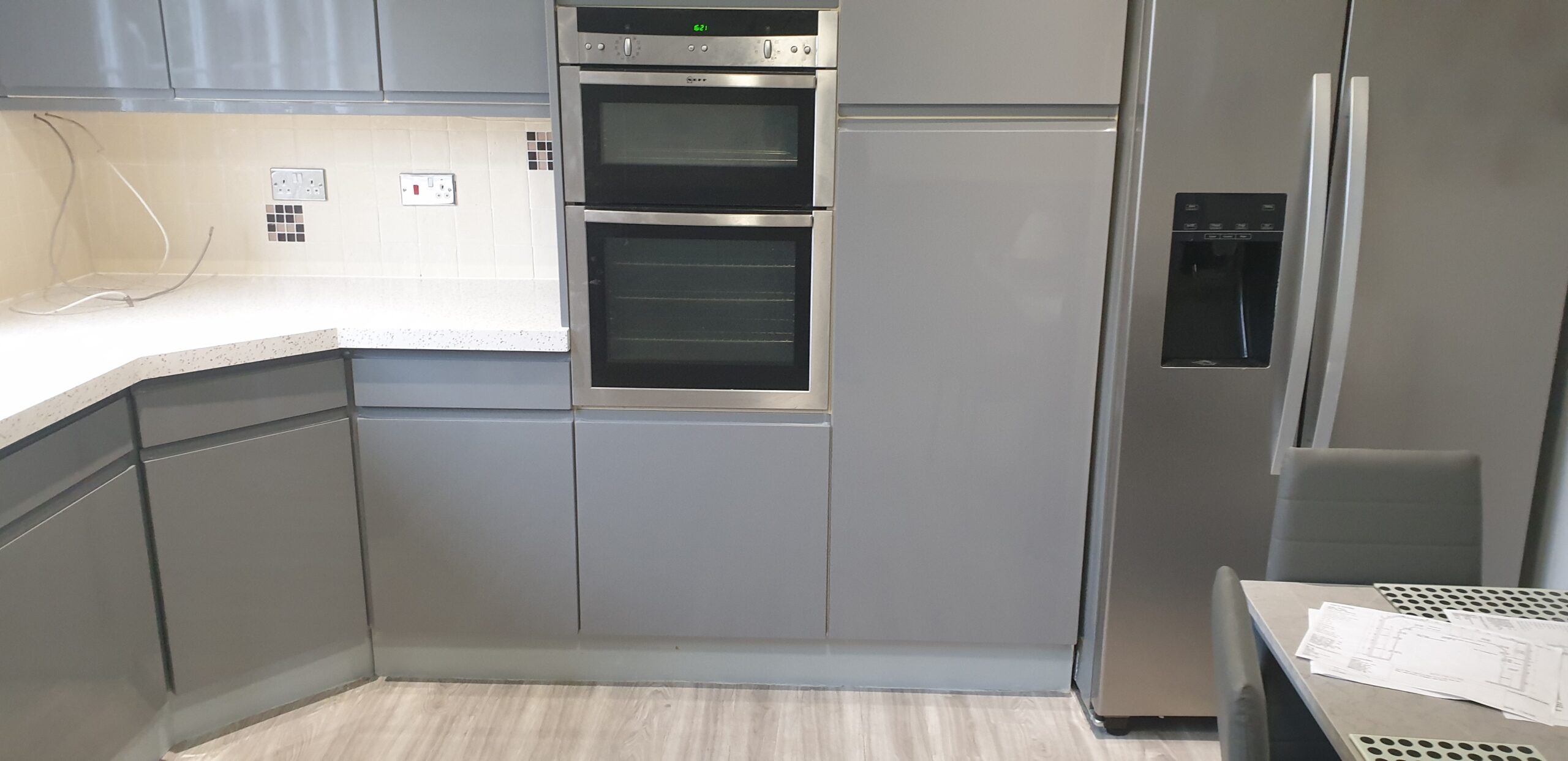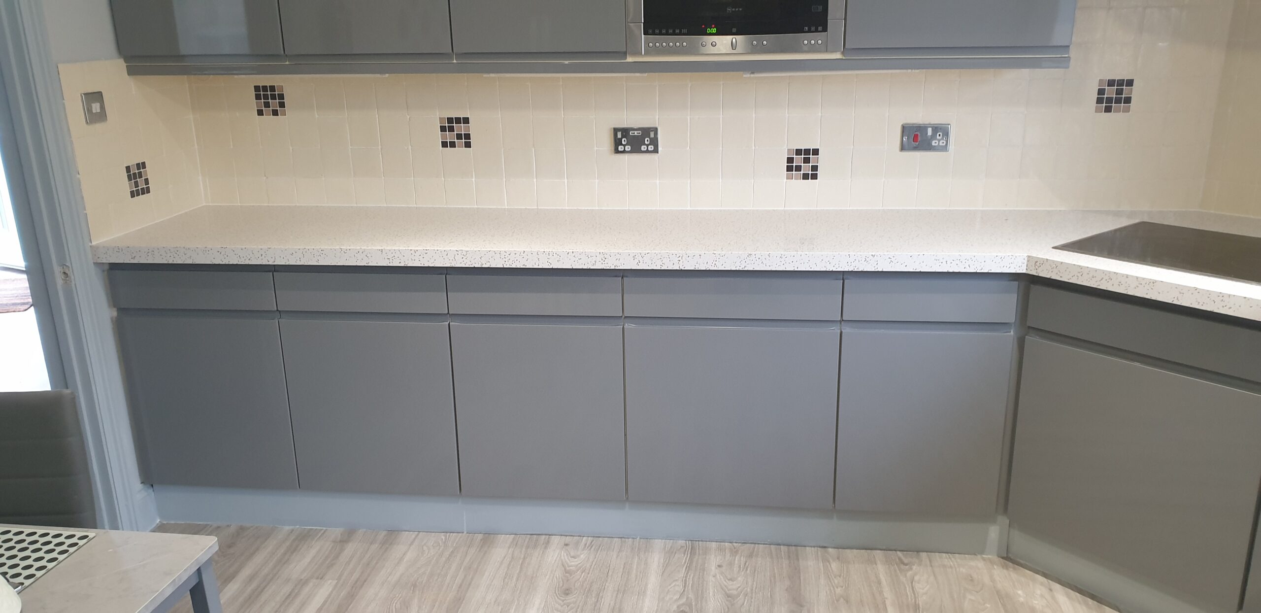 With functional durability, This kitchen now combines sharp contemporary design. The Gloss Dust Grey doors give depth and reflective light, while the White Glitter worktops add sparkle and brightness. Together, they create a sophisticated, high-end look at a fraction of the time and cost of a full renovation.