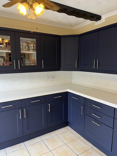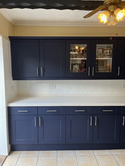 “I can’t believe the difference! The new blue doors and sparkling quartz worktops have made my kitchen look so sleek — it feels like a completely different room.”– Mrs Silk, East Cowes