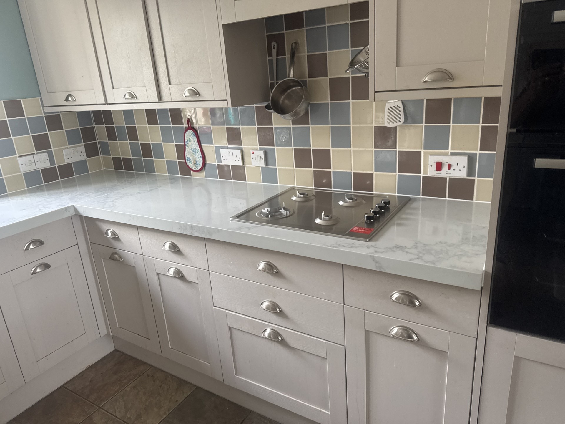- Worktops: Installed Calacatta Canyon quartz overlay worktops. With its white base and delicate grey veining, the surface adds timeless sophistication and reflects light beautifully.