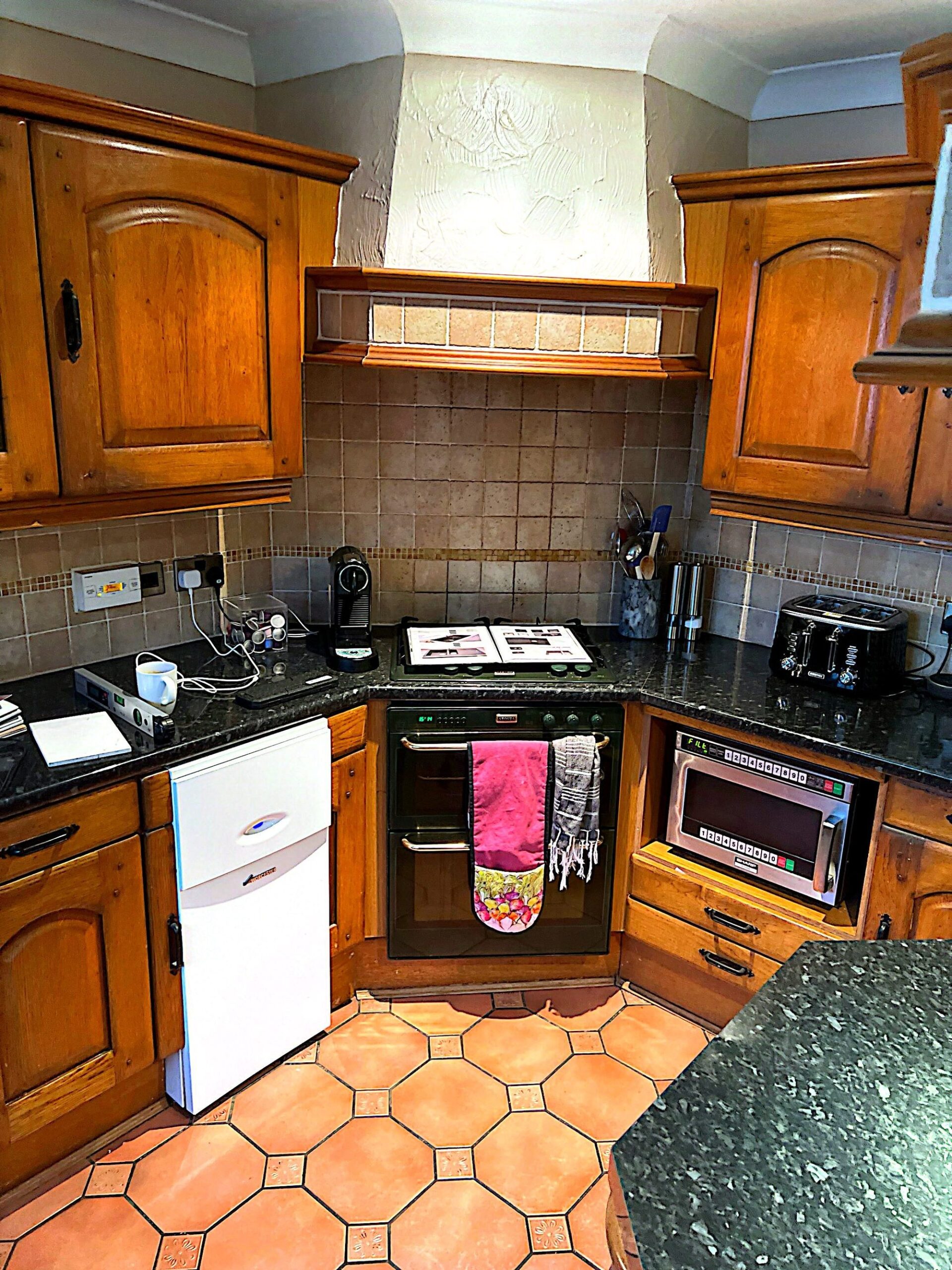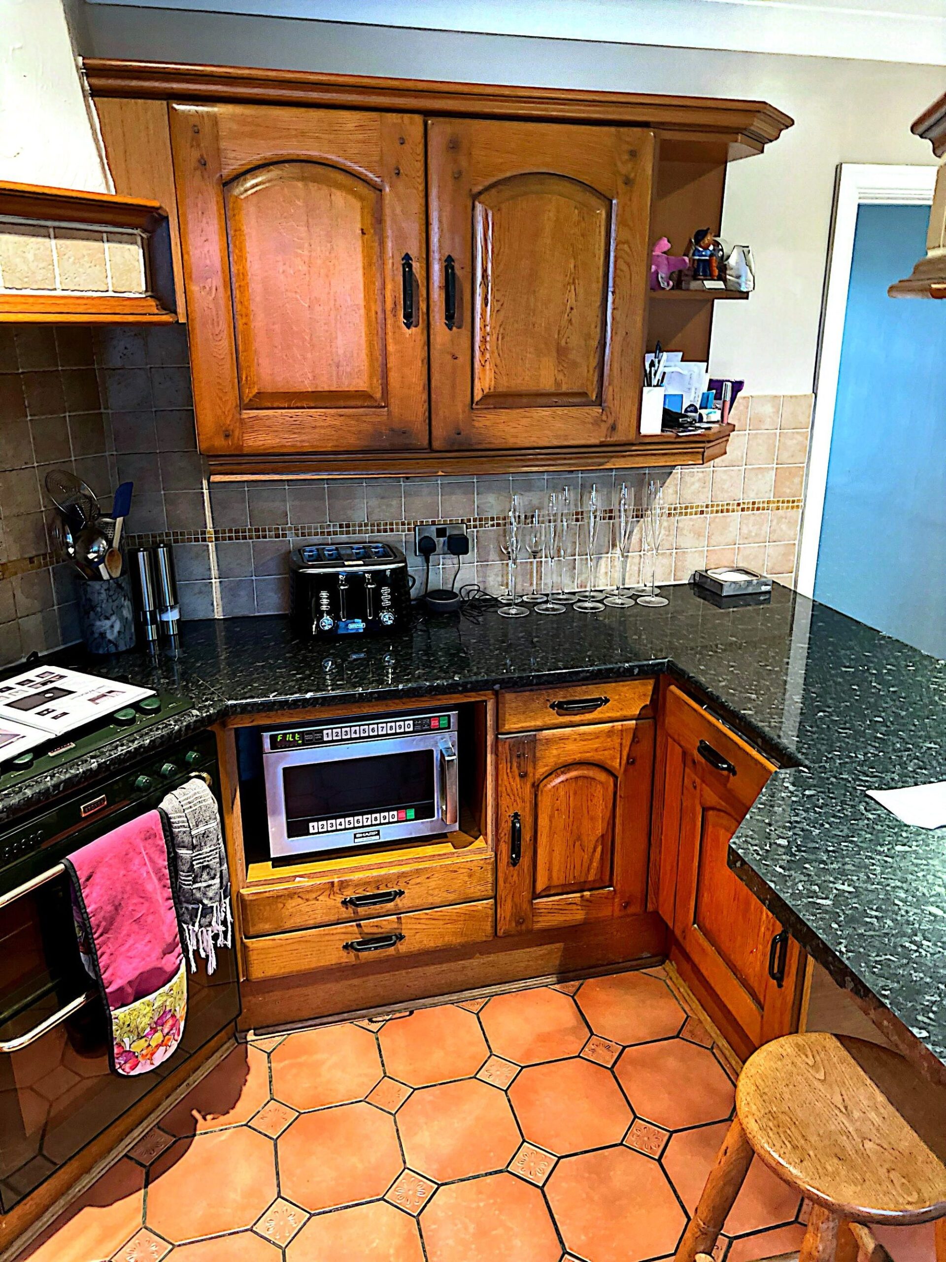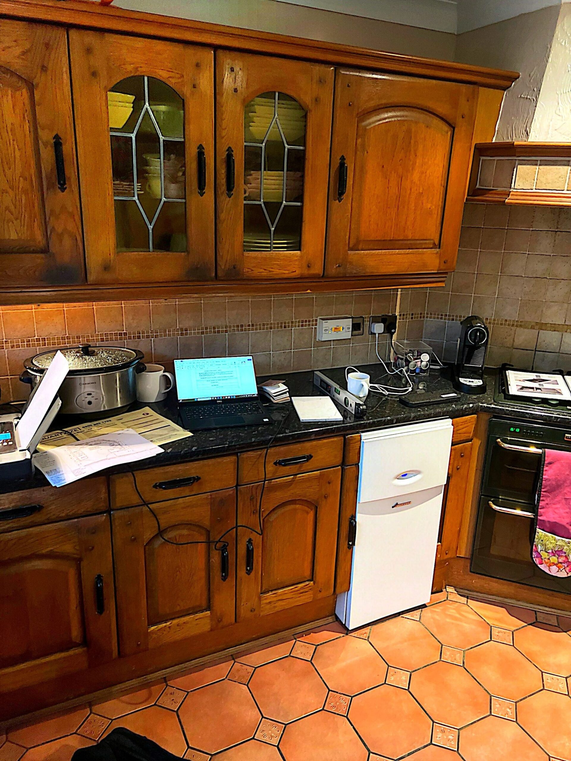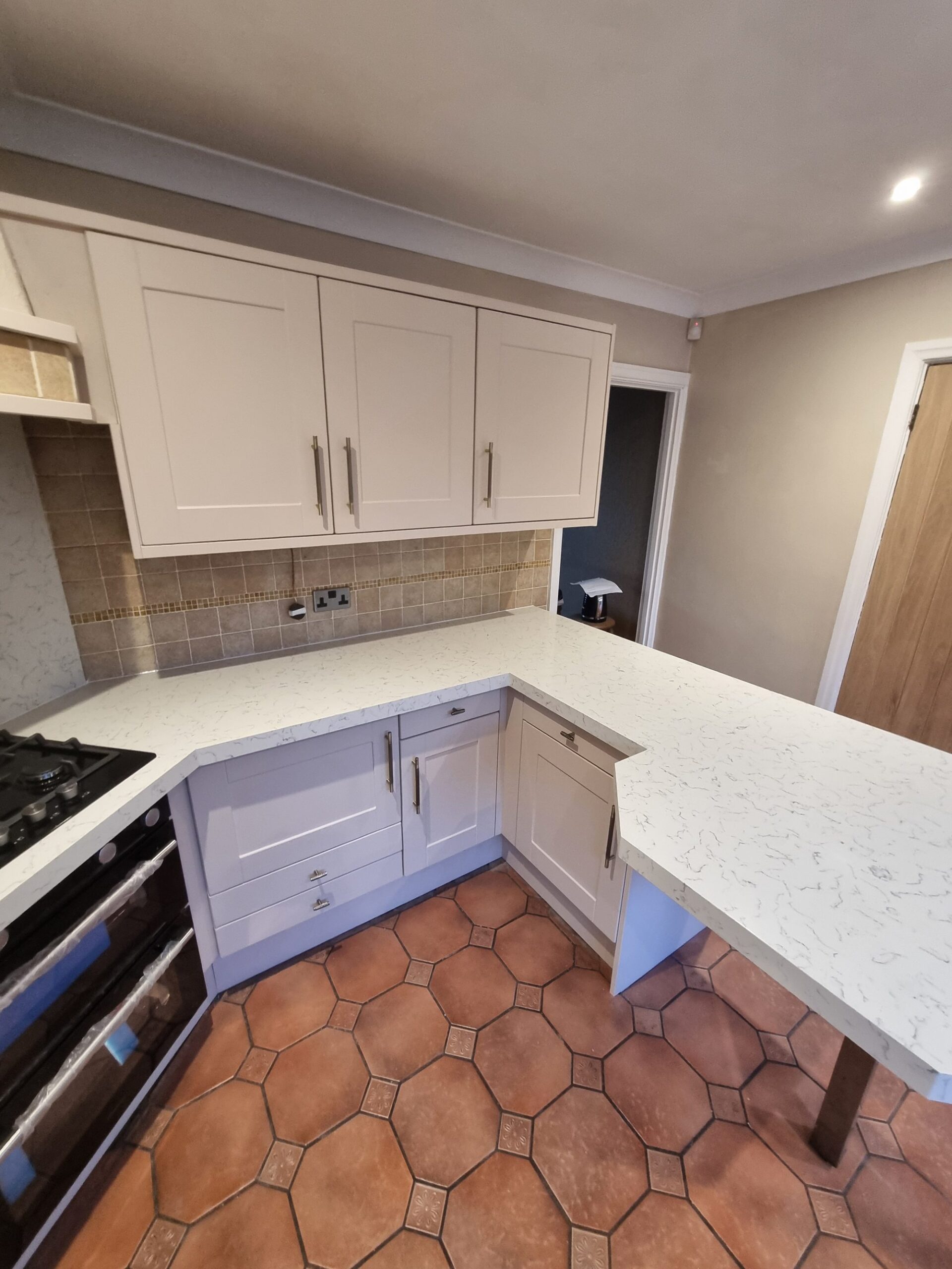 David’s Huddersfield kitchen felt dark and dated, with heavy wood cabinetry and black worktops soaking up the light. Quartzize were asked to create a softer, brighter space without replacing the existing layout. By updating both the doors and worktops, the room now feels calmer and more spacious while still working harmoniously with the original terracotta floor and tiles.