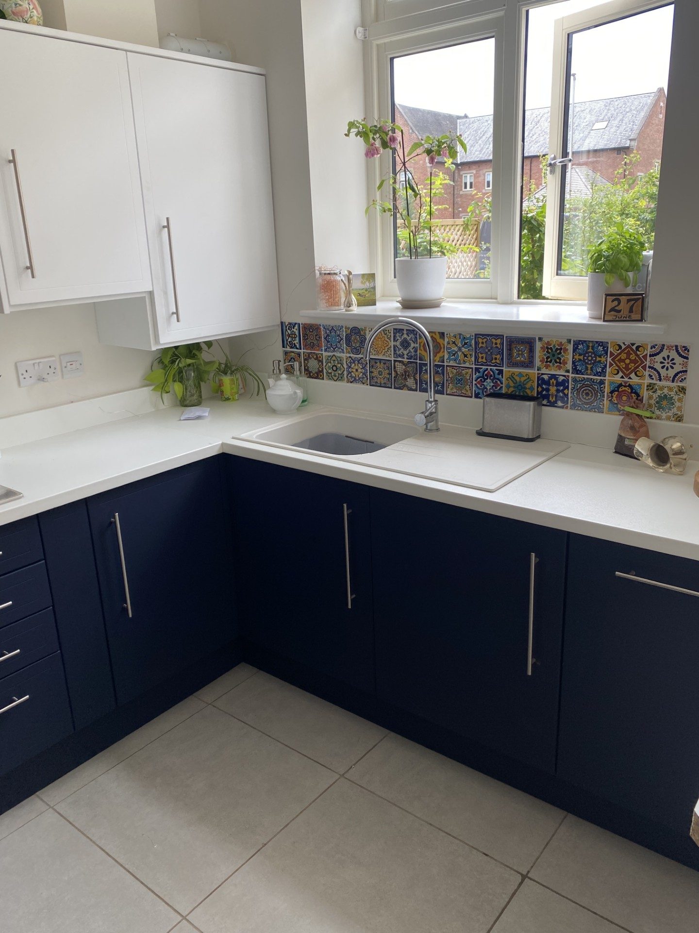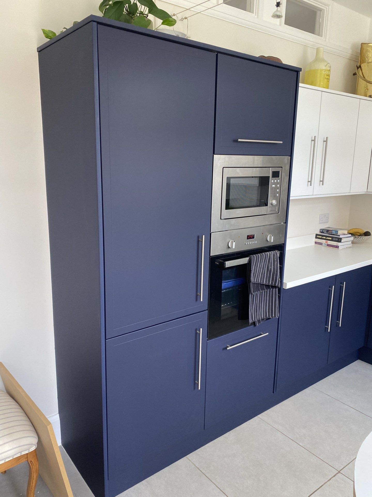The before-and-after refresh completely revitalised Alison’s kitchen. The boldness of the Marine Blue grounds the design, while the Porcelain upper units lift and balance the space. The overall effect is light, refined, and full of personality — all achieved without the cost or mess of a full full refit.